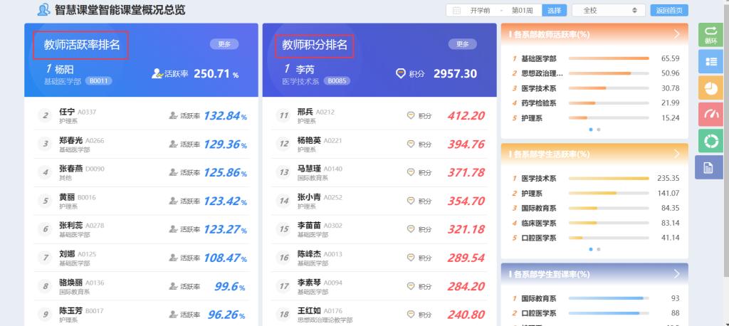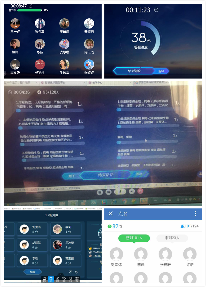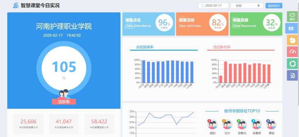 通过我院智慧课堂后台数据分析显示,开学第一天我院线上教学运行良好:128门课程顺利开课,93个教学班级均按时点名签到,学生到课率96%以上。师生线上互动良好,共发起即时问答、头脑风暴、随堂测验等课堂活动626次,平均每个课堂发起活动2.1次,活动参与率在80%以上。教师共发布各种资源771个,资源浏览人次62858人次。