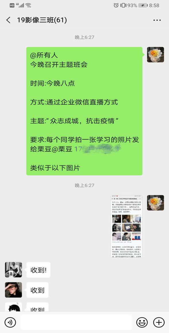 晚上,组织学生通过“企业微信”直播平台召开了“众志成城、抗击疫情”的主题班会,开展网课正能量教育,就新冠肺炎疫情进行了开学第一课网络教学。