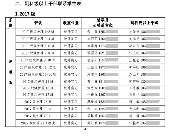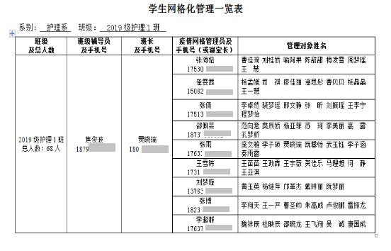 学院印发《关于建立新冠肺炎防控期间领导干部联系班级多级联防机制的通知》文件,全体学生分别划分到一个小组当中,每一小组为一个单元格,明确了疫情防控期间工作职责和信息上报的责任人,建立了“领导干部—辅导员—班长(学生干部)—宿舍长(小组长)—普通学生”工作体系,确保信息畅通,情报准确,把每天排查的学生动态信息进行汇总和上报,做到“日报告”“零报告”,精准掌握,不漏一人、不留死角。