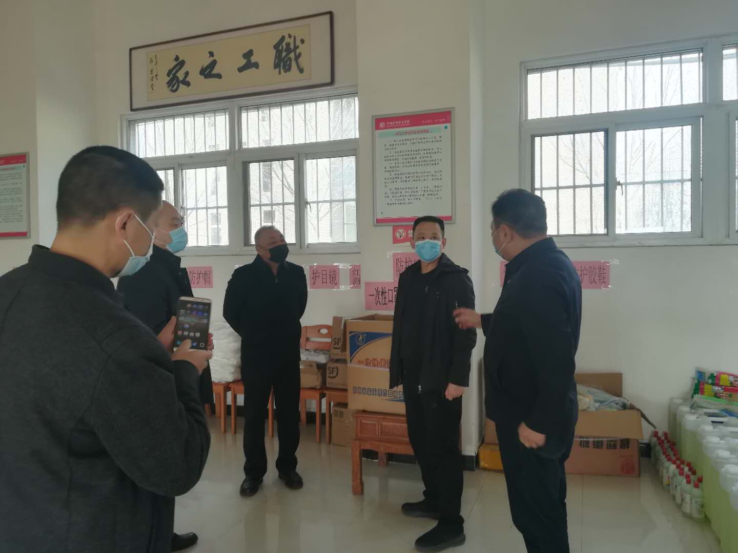 赵世辉副秘书长一行来到学院防疫物资储备仓库,检查了学院消毒液、酒精、口罩、测温枪、防护服等防疫物资储备情况,仔细询问物资的管理、发放及登记工作等情况,并认真查阅了学院疫情防控工作手册、多级联防联控网格化管理工作手册等资料。