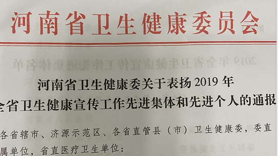 近日,河南省卫生健康委下发了《关于表扬2019年全省卫生健康宣传工作先进集体和先进个人的通报》,我院被授予“2019年全省卫生健康宣传工作先进集体”荣誉称号。