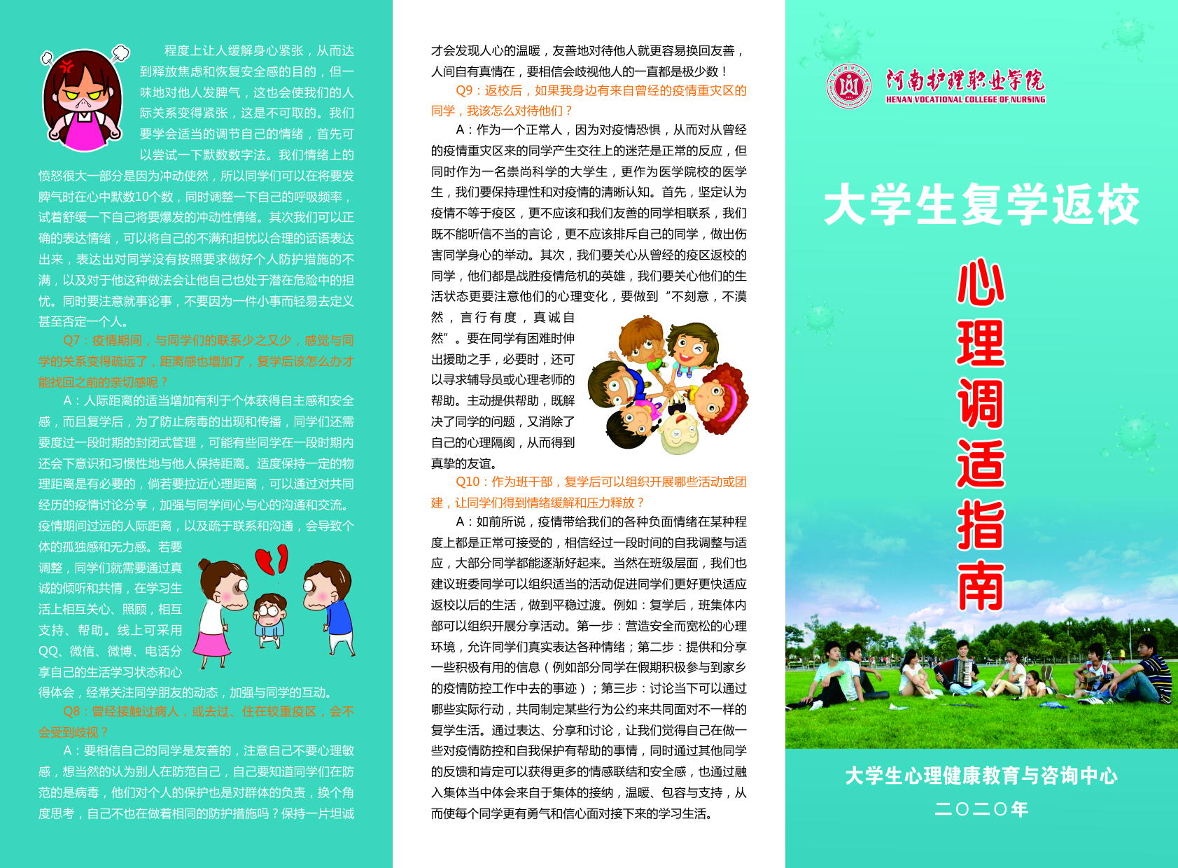 结合疫情防控要求,心理中心印制5000余份《大学生复学返校心理调适指南》,从情绪调适、学习调适、以及人际关系调适三方面着手,向学生进行心理知识科普,并根据不同群体有针对性地列出相应的心理防护策略。