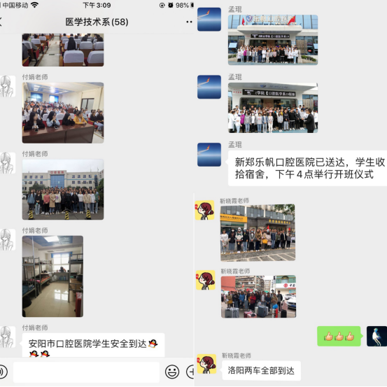 经过医学技术系主任姚延明与联合培养医院的不断交流,长期筹划和安排,10月5日,口腔医学专业160人,康复专业40人,在辅导员的帮助和指导下收拾行李、装车准备。医学技术系党总支书记窦俊峰到现场慰问学生,辅导员代表孟琨、付娟、靳晓霞、和琪等老师同车护送,负责协助医院管理学生教学工作。大巴于早上8点准时出发,带队老师在工作群内实时汇报学生抵达情况,各地市联合培养班陆续到达,截止下午3点,已有三家医院完成学生交接工作,教改班学生离校工作井然有序,顺利开展。