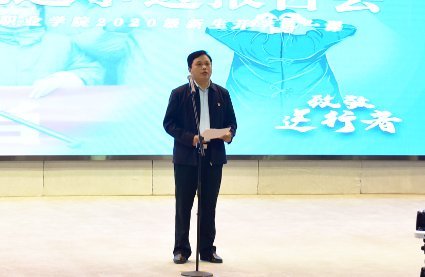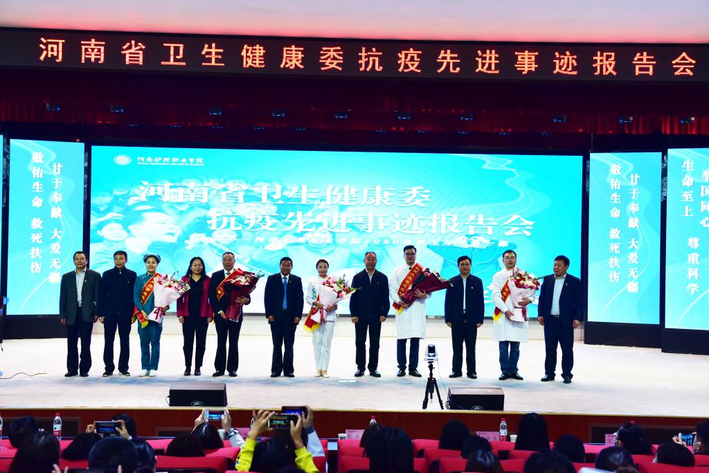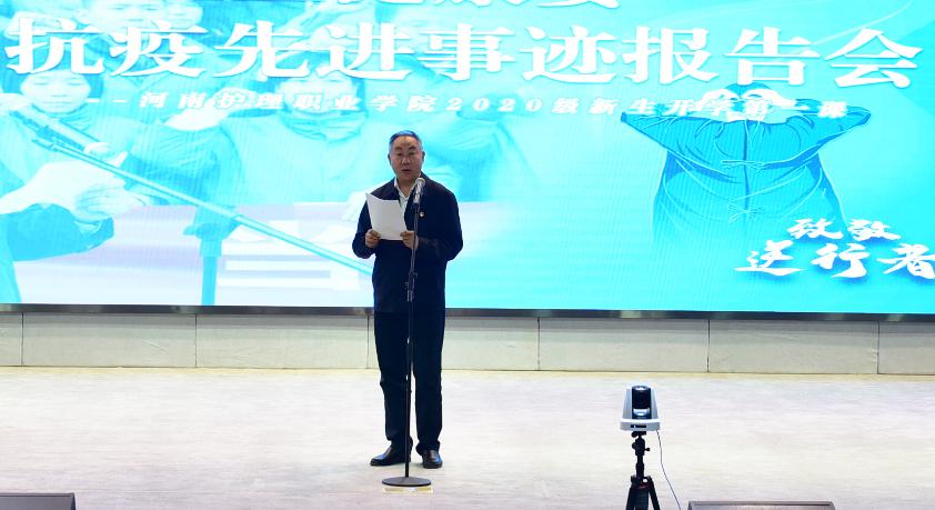 为大力弘扬伟大抗疫精神,致敬最美逆行者,加强师生的爱国主义教育,引导广大师生感悟伟大的民族精神、感受榜样力量,10月13日上午,我院邀请河南省卫生健康委抗疫先进事迹报告团来院为万余名师生上了一堂印象深刻、意义非凡的开学第一课。省卫生健康委宣传处二级调研员赵圣先、学院党委书记杜天信、院长郭茂华,党委副书记、工会主席胡景团,副院长王家桥、纪委书记张远出席报告会。