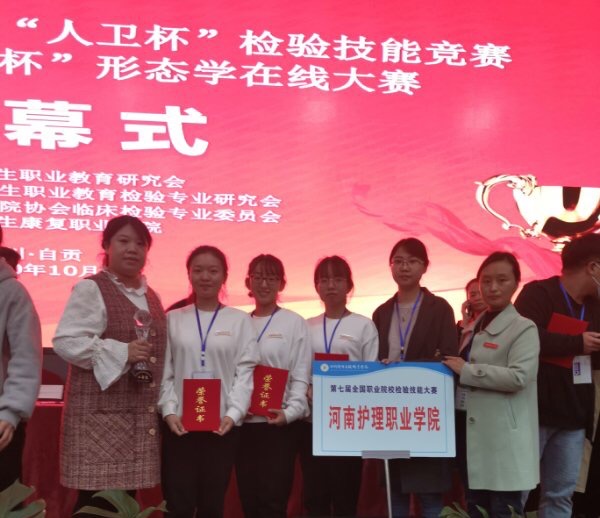 金秋十月,10月17日至19日我院选派药学检验系师生代表参加了由全国卫生职业教育教学指导委员会医学检验技术专业分委会主办的第七届全国职业院校“人卫杯”检验技能竞赛暨第二届“华教杯”形态学在线大赛。在本次大赛中,我院荣获团体三等奖和个人单项一等奖三个,单项二等奖一个,单项三等奖三个:2018级医学检验技术一班兰燕池荣获寄生虫检验操作技能项目一等奖、形态学检验项目一等奖与白细胞计数分类及临床应用项目优秀奖;张楠荣获免疫学检验项目一等奖、形态学检验项目二等奖与总蛋白测定及临床应用项目三等奖;魏晓荣荣获细菌检验项目三等奖与形态学检验项目三等奖;其中形态学检验项目荣获满分,寄生虫学检验项目第一名。