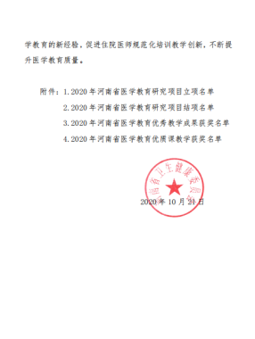 近日,河南省卫生健康委员会颁布了《关于公布2020年河南省医学教育研究项目立项教学成果和优质课评选结果的通知》(豫卫科教〔2020〕24号)文件,我院喜获佳绩,这也是对我院科研教学水平的充分肯定。
