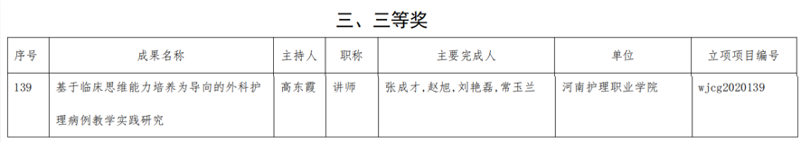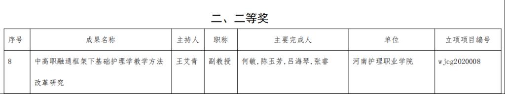 护理系王艾青教授申报的《中高职融通框架下基础护理学教学方法改革研究》顺利结项并获得医学教育优秀教学成果二等奖,护理系高东霞教授申报的《基于临床思维能力培养为导向的外科护理病例教学实践研究》顺利结项并获得医学教育优秀教学成果三等奖。