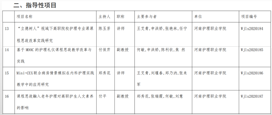 由护理系付平副教授牵头的《课程思政融入老年护理对高职护生人文素养的影响》、付保芹副教授牵头的《基于MOOC的护理礼仪课程思政教学改革与实践》、护理系郑秀花讲师牵头的《Mini-CEX联合病房情景模拟在内科护理实践教学中的应用研究》、护理系陈玉芳讲师牵头的《立德树人视域下高职院校护理专业课程思政改革实践研究》四个教育研究项目获得立项。
