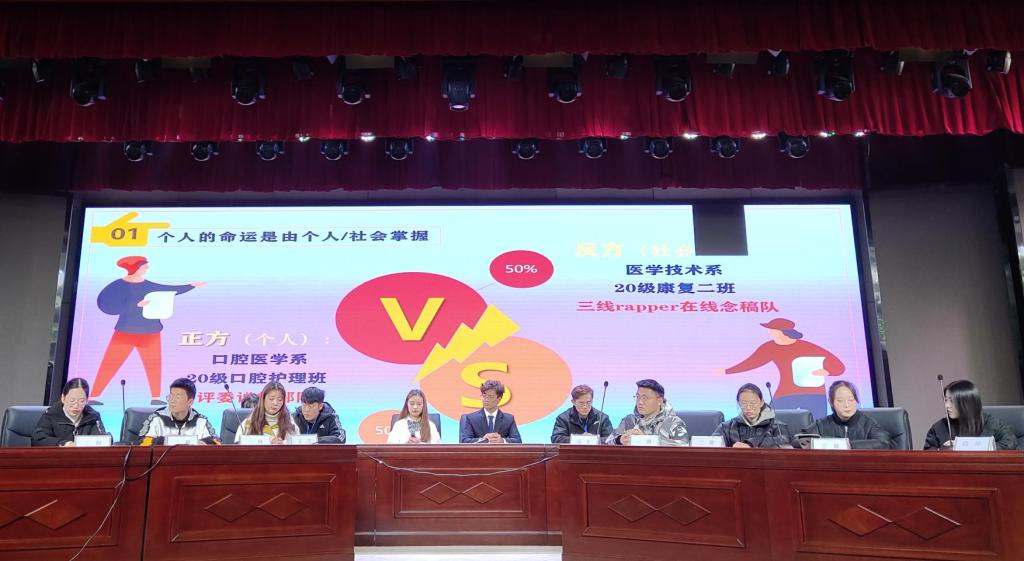 为营造良好的学术氛围,锻炼大学生的思辩能力、应变能力和语言表达能力,展现当代大学生的风采,12月2日下午,口腔医学系与医学技术系联合举办的“能言善辩真英雄”辩论赛决赛在学术报告厅二楼隆重举行。此次比赛的评委有口腔医学系杨娟娟、刘佩琪、欧阳佩佩老师及学生干部代表罗馨慧;医学技术系张晓玉、马钰、申涵玉老师及学生干部代表陈阳。19级、20级无课学生参与活动,现场气氛热烈、掌声阵阵。