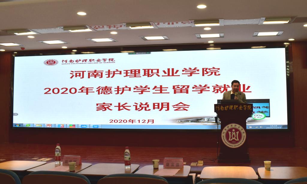12月13日下午,国际教育系在学术报告厅顺利召开了德护学生留学暨就业家长说明会。国际教育系全体教职工及专兼职辅导员老师参与会议。应邀出席的有德中友好协会首席代表、玛雅国际教育集团董事长侯登峰,河南医学高等专科学校护理系党总副书记、系副主任张继娜。会议由国际教育系主任骆焕丽主持。