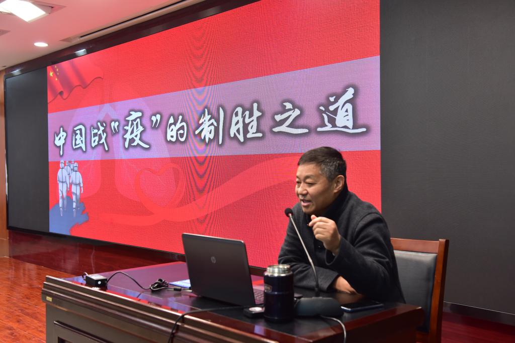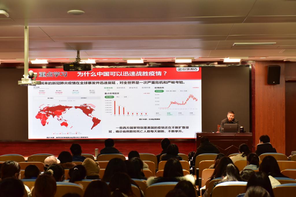 郭院长以“中国战疫的制胜之道”为主题,讲解了疫情防控斗争中所彰显的中国共产党领导和中国特色社会主义的显著优势、人民群众的力量之源和我国在全球战“疫”中所表现的大国担当,并通过阐释伟大抗疫精神、红旗渠精神和河护精神,号召全体师生“情出自愿、不负遇见”,为学院发展努力奉献。讲课过程中,郭院长通过大量的视频、真实的案例、精心的设计,辅之以精彩的点评、巧妙的串联、及时的互动,使得整堂课主题突出、逻辑严谨、触人心灵、催人泪下。郭院长讲出了思想的高度、理论的深度、世界的广度、情感的温度,给现场师生奉献了一堂收获满满的思政金课。
