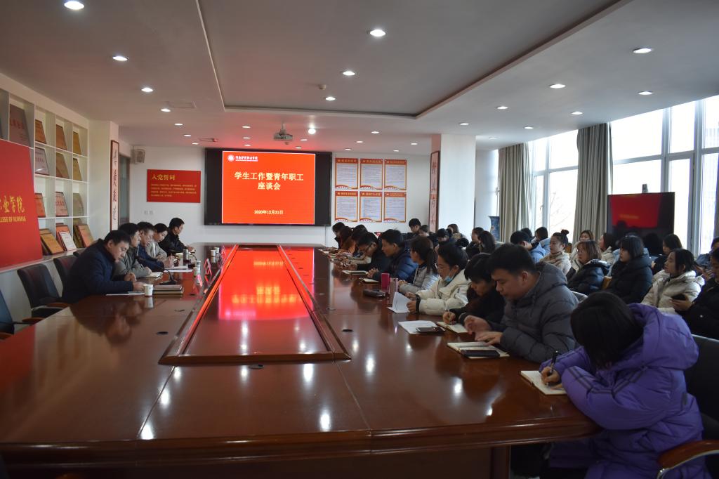 青年是事业发展的未来和保障。为进一步了解青年职工的情况,增进团学战线青年职工的交流,12月31日下午,学院团学工作暨青年职工座谈会在第一会议室召开,主管学生工作的副院长王家桥,学工部、各系党总支、团委、各系团总支相关负责人及部分青年专兼职辅导员代表共计40余人参加本次会议。会议由学工部副部长金志利主持。