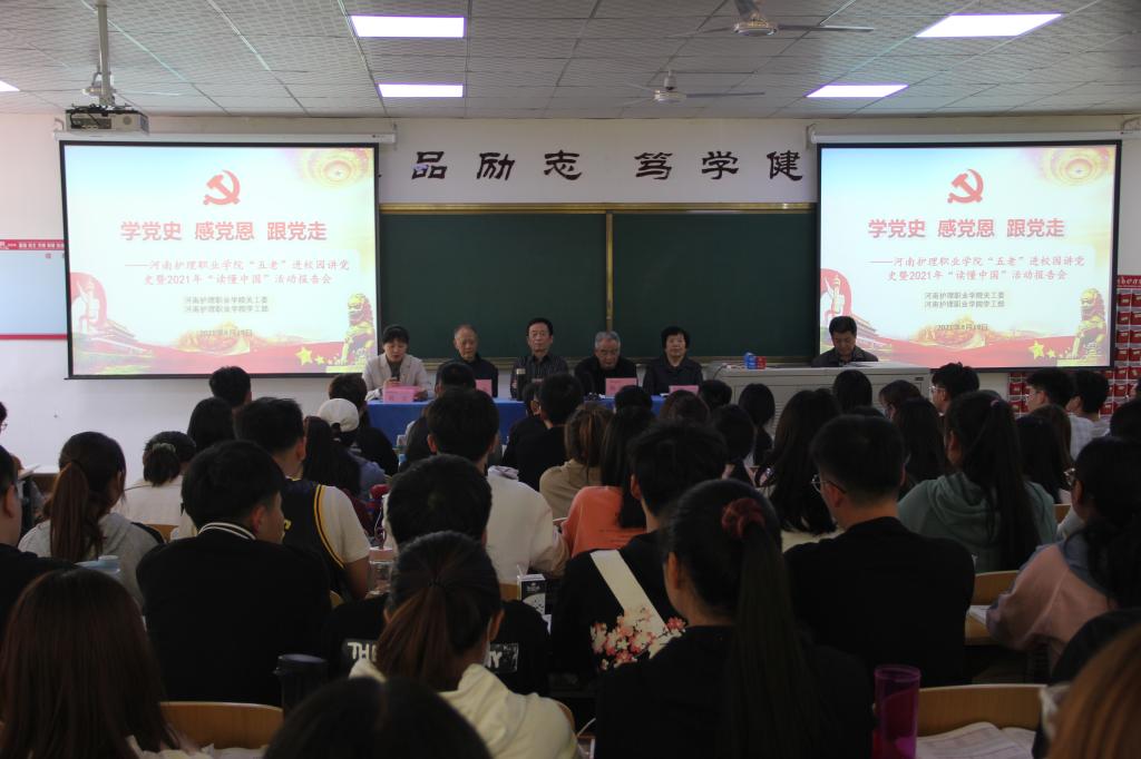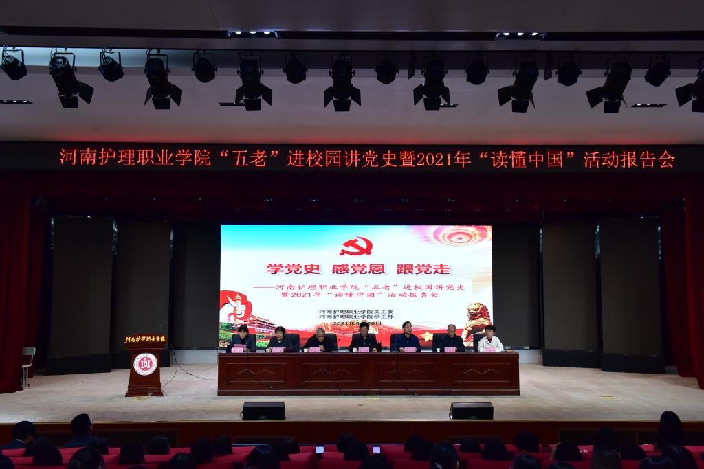 今年是中国共产党建党100周年,也是我院建校70周年,为深入开展党史学习教育,教育引导广大青年学生爱党、爱国、爱社会主义,学院按照上级有关要求,4月19-20日,由学院关工委和学工部联合举办的“五老”进校园讲党史暨2021年“读懂中国”活动报告会分别在院本部和北院区举行。学院副院长钟会亮,“五老”代表潘登善、韩超元、王秋海、张伶聪,学工部部长李艳芳,各系党总支书记,离退休职工工作处副处长兼学院关工委办公室主任陈方以及全院师生800余人参加了报告会。