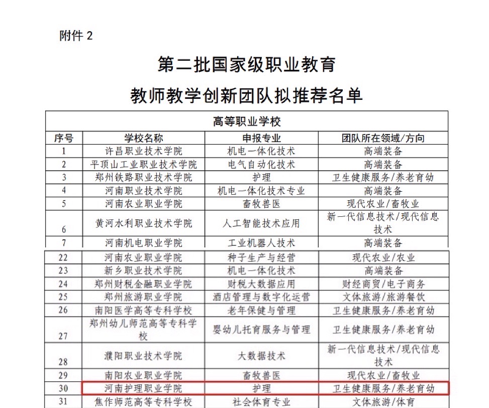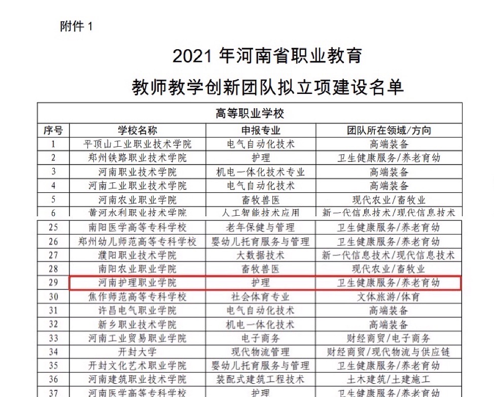 近日,河南省教育厅发布《关于2021年河南省职业教育教师教学创新团队拟立项建设名单和第二批国家级职业教育教师教学创新团队拟推荐名单的公示》文件,我院院长郭茂华领衔的护理专业教学创新团队,经过学院申报、省教育厅资格审查和专家评审,成功立项为河南省职业教育教师教学创新团队建设项目,并被推荐参评第二批国家级职业教育教师教学创新团队申报。