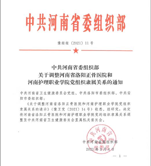根据《中共河南省委组织部关于调整河南省洛阳正骨医院和星空XK体育党组织隶属关系的通知》(豫组组〔2021〕11号)文件要求,按照“理顺关系,加强领导,便于管理”的原则,自2021年3月4日起,我院党组织由原隶属安阳市委正式调整为隶属于河南省卫生健康委直属机关委员会管理。