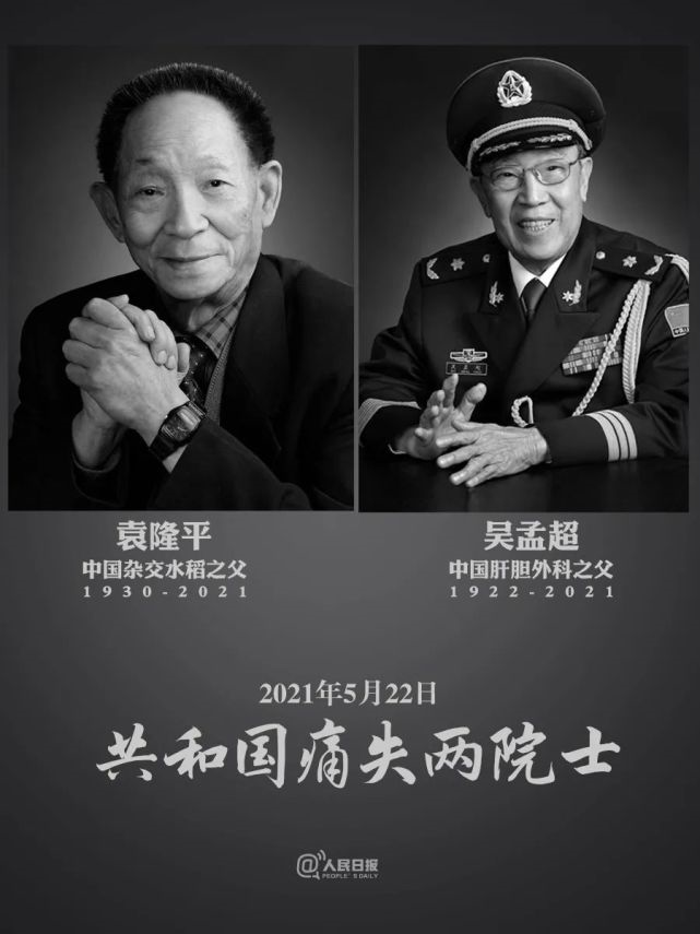 袁隆平院士用一粒种子改变世界,帮助中国人“端牢饭碗”。他把人民放在心上,而我们将他牢牢记在心中。吴孟超院士奉行勇于创新,永不满足,在肝脏外科领域取得了众多的成就,震惊世界。国士无双,向两位逝去的院士致敬!