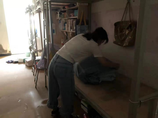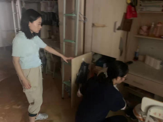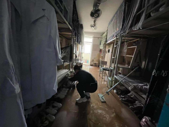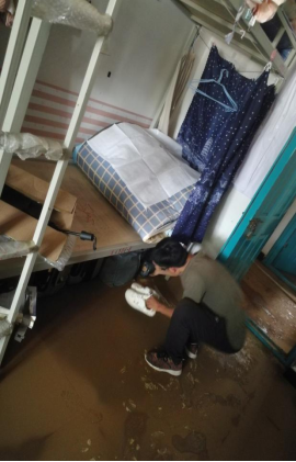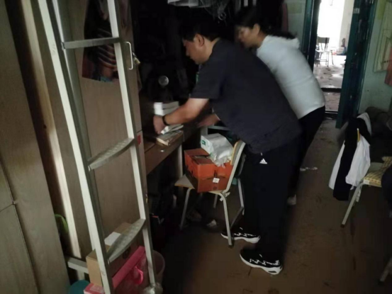 4-5号公寓1楼地面有明显泥沙沉淀,许多学生的鞋子、箱子等被水浸泡,场面让人十分揪心。在窦俊峰书记的指挥下,大家齐心协力为学生们打扫地面,清理床下物品,帮学生晾晒被褥和衣物,通风防潮,切实保障学生的住宿环境。