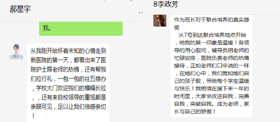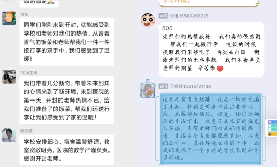 热情洋溢的欢迎语、医院领导科室人员雨中矗立的等候、礼仪姐姐清晰明白的引导、医务哥哥坚定臂膀扛起包裹的背影,餐厅可口的饭菜、崭新免费暖暖的被褥、干净整洁的宿舍、宽敞明亮的教室,同学们的意见建议被耐心倾听,全力沟通解决的做法,事事处处无不传递着联合培养单位对河护学子的重视,对职业教育的支持,为同学们在医院联合培养基地更好的生活、学习,竭尽全力保驾护航。