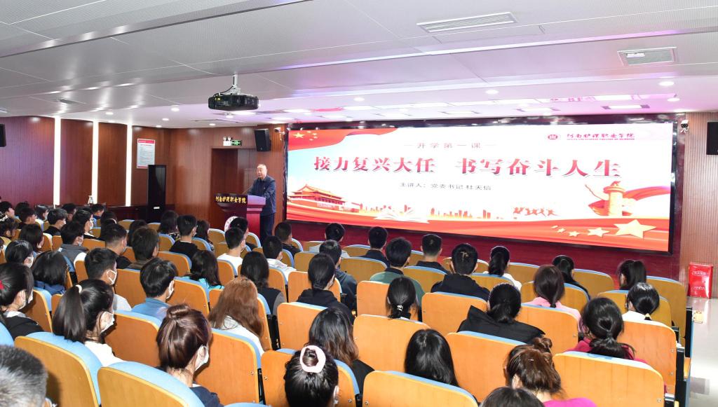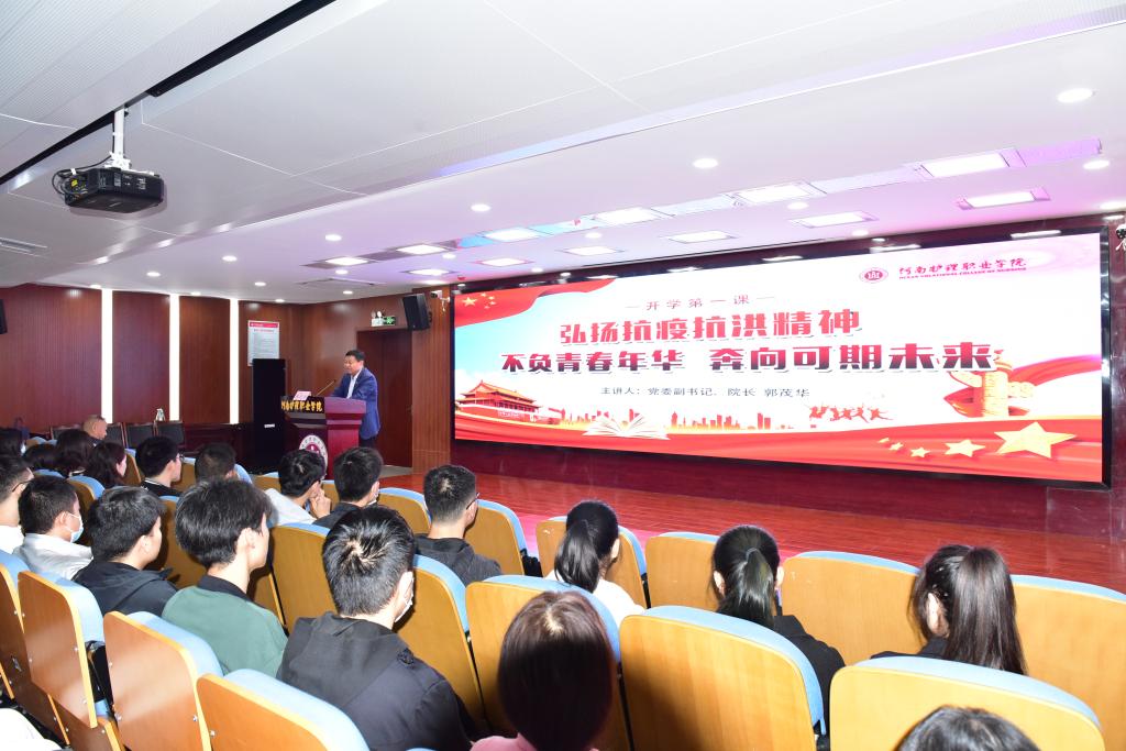 为贯彻落实河南省教育厅《关于组织全省学校上好2021年秋季开学思政第一课的通知》,深入开展“把灾难当教材 与祖国共成长”主题教育,10月18日上午,2021级新生开学第一课在我院学术报告厅开讲。学院党委书记杜天信,党委副书记、院长郭茂华为新生授课,2021级学生代表共计300余人现场聆听授课,4500余名新生在教室观看直播。开讲仪式由党委组织宣传统战部部长郭宏轶主持。
