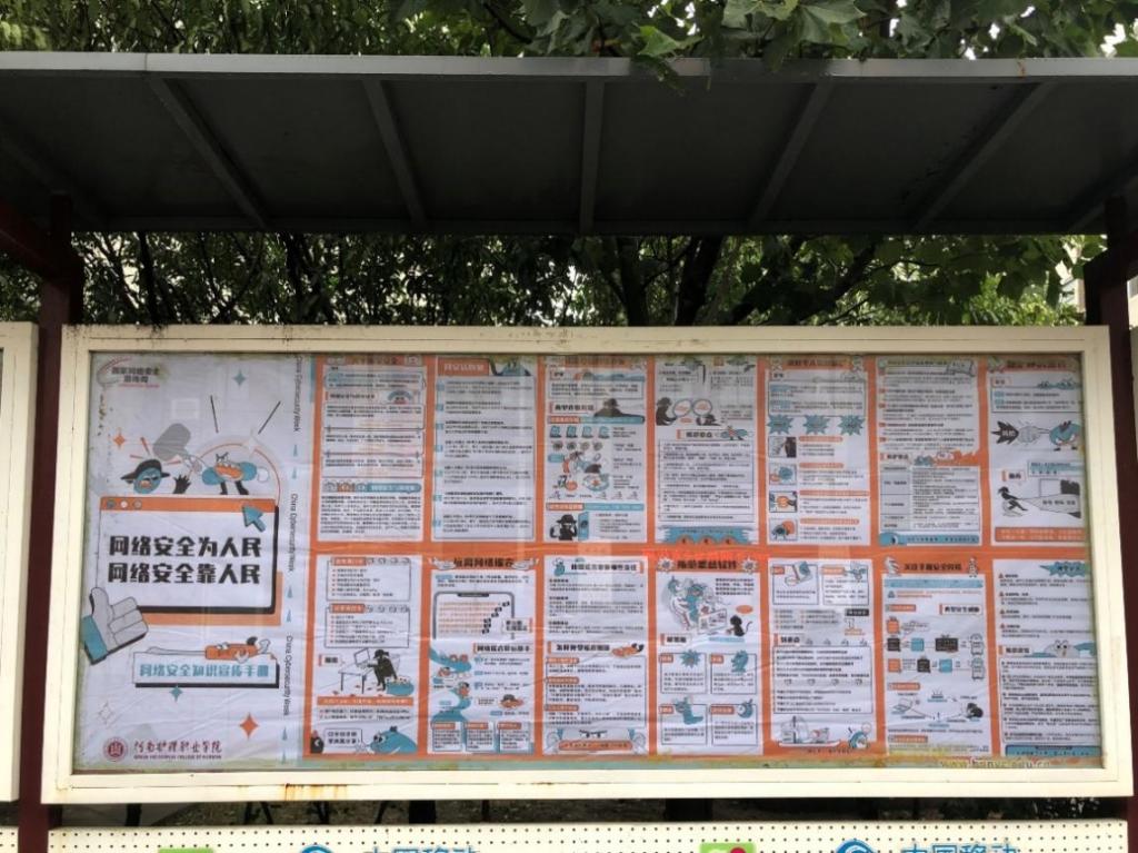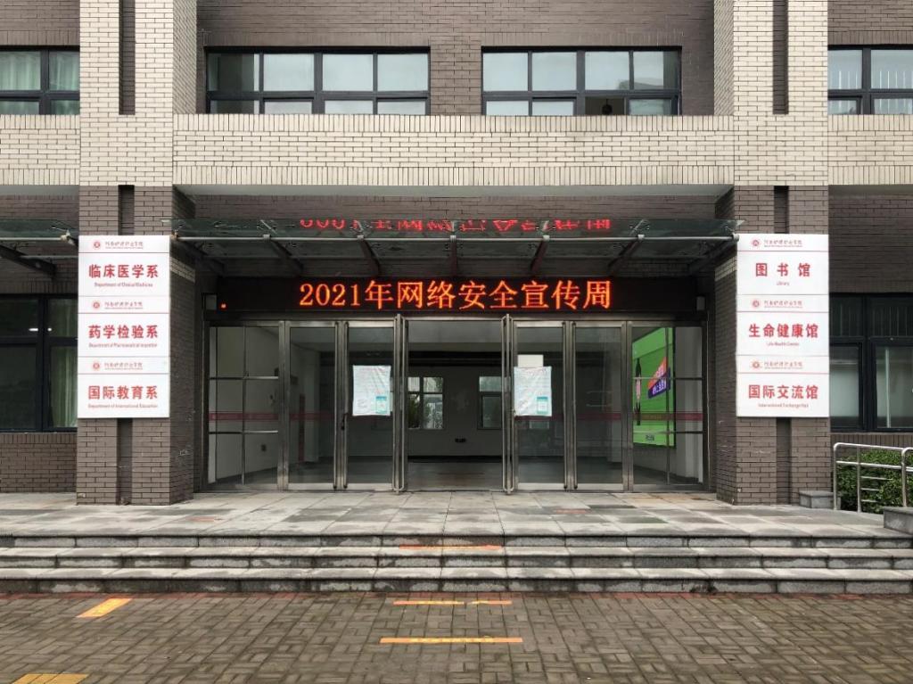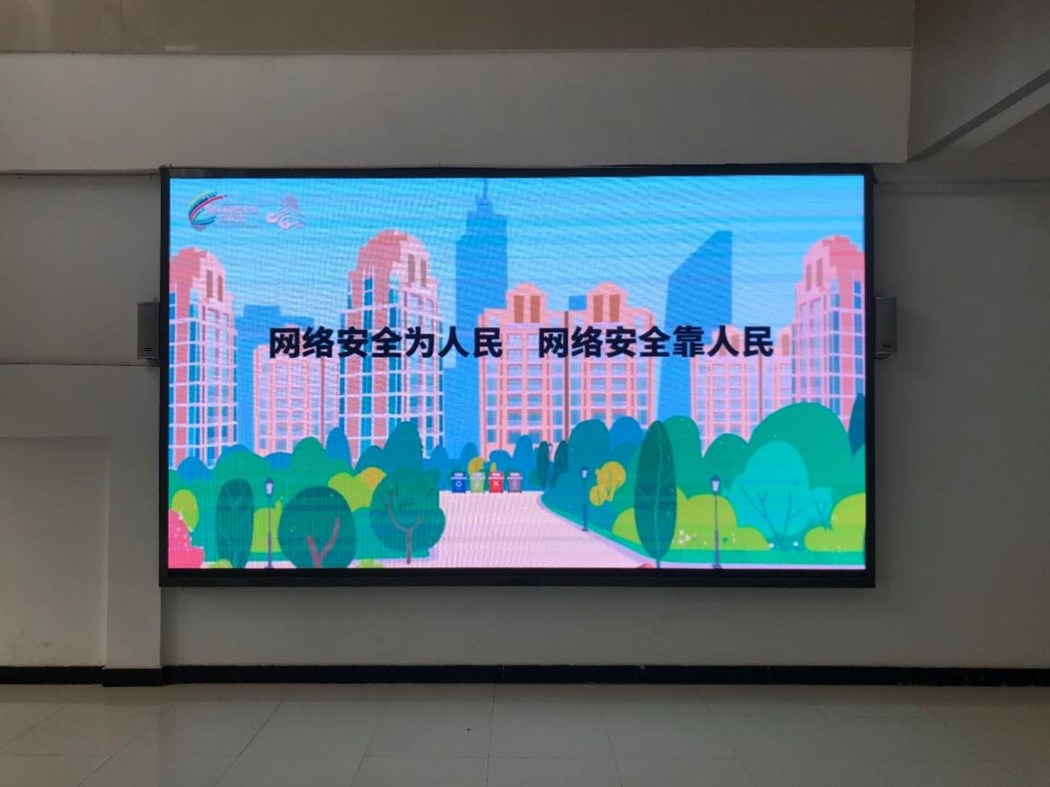 宣传周期间,医技楼橱窗张贴了网络安全宣传海报,各楼宇电子显示屏循环播放网络安全周微视频及标语。
