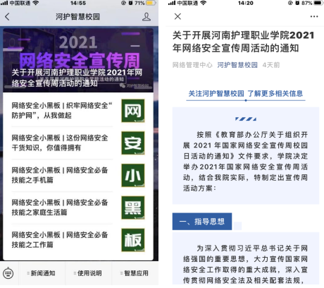 同时学院网站还设置了“网络安全”专栏,在微信公众号上推送网络安全相关微信。
