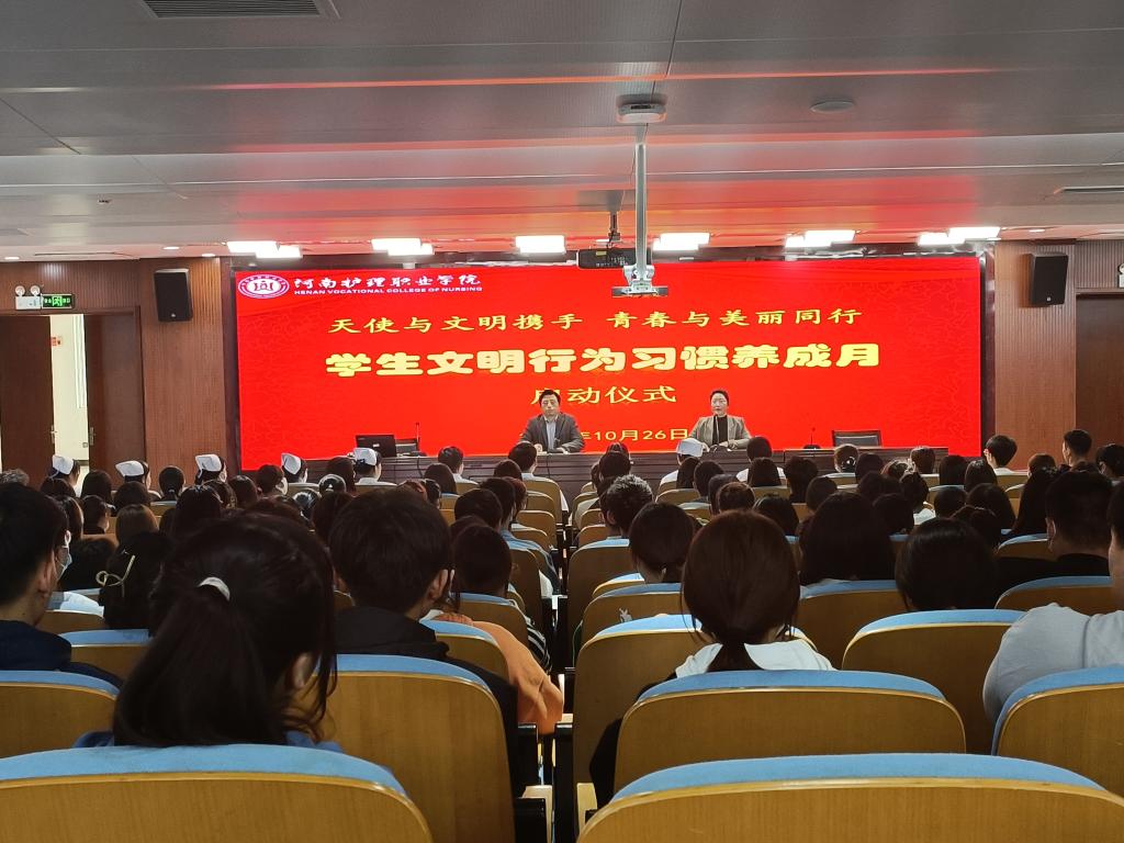 为提高青年学生文明素养、树立良好风范,促进学生全面发展,推动学院创建文明校园建设,我院护理系于10月26日下午在学术报告厅一楼,召开“天使与文明携手,青春与美丽同行”为主题的学生文明行为习惯养成月启动仪式。护理系党总支书记王昆仑出席会议。仪式由护理系党总支副书记、学生党支部书记胡丽芬主持,学院所有专兼职辅导员及2021级、2020级学生干部200余人参加。