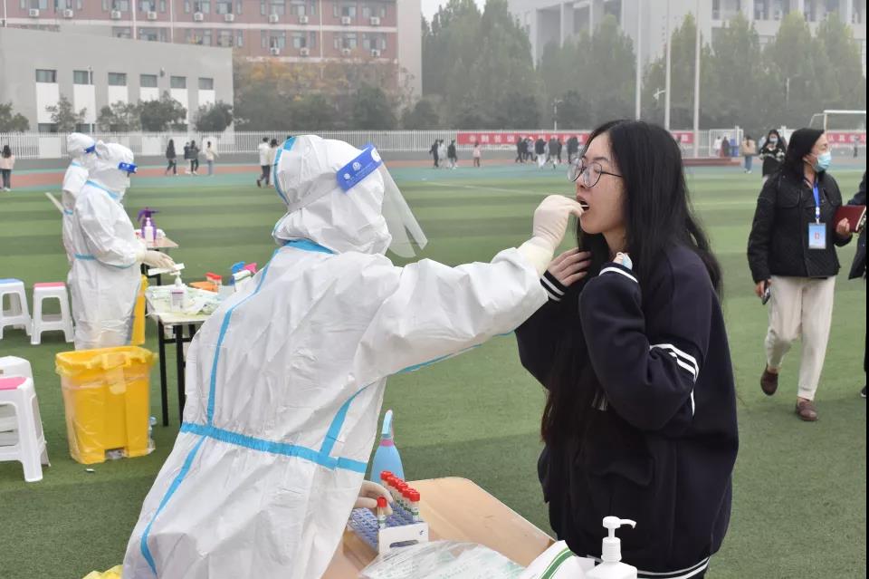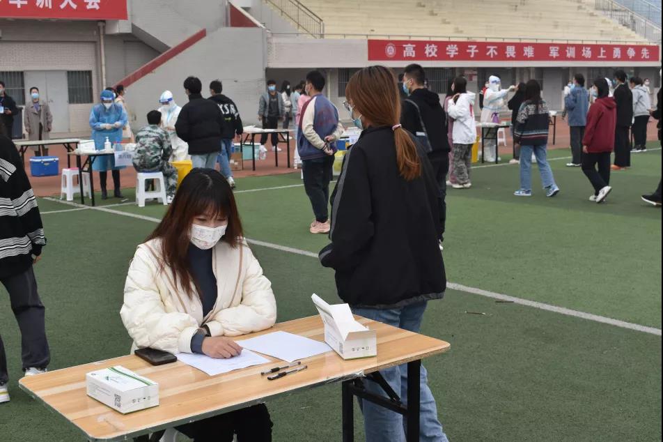 前来检测的人员听从指挥,佩戴口罩,距离相隔一米,有序排队,按照班级分批接受采样和筛查。