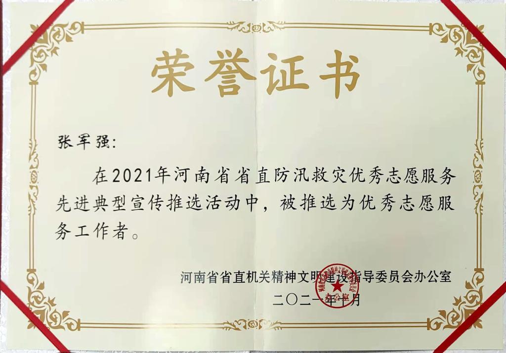 近期,在2021年河南省省直防汛救灾优秀志愿服务先进典型宣传推选活动中,我院工会职工张军强老师被推选为优秀志愿服务工作者。