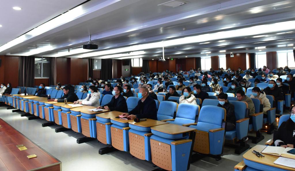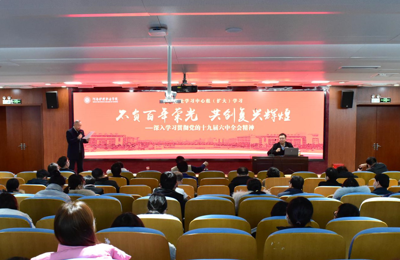 12月27日下午,我院在学术报告厅一楼召开党委理论学习中心组(扩大)学习会议,邀请省委宣讲团成员、河南大学马克思主义学院副院长刘嘉尧教授为广大教师宣讲党的十九届六中全会精神。学院领导班子成员出席会议,副科级以上干部、马克思主义学院专兼职教师及全体行政人员参加会议。会议由党委书记杜天信主持。