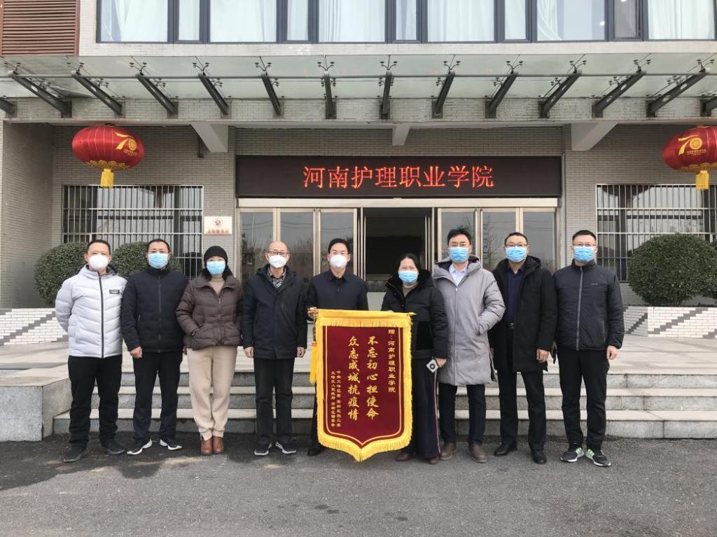 1月30日下午,安阳市高新区管委会四级调研员孟君芳、高新技术创业服务中心主任靳冬一行来到我院,代表文峰区(高新区)将一面写有“不忘初心担使命,众志成城抗疫情”的锦旗送到我院,对高新区疫情期间,逆行出征、冲锋在前,坚守“疫”线的教职工表示衷心的敬意和感谢,副院长钟会亮代表学院受赠锦旗。
