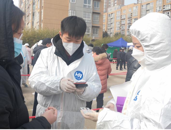疫情就是责任,防控就是命令。院外战场,医学技术系教师志愿者身披白色战甲,根据疫情防控指挥部的统一部署,在第一时间挺身而出,逆流而上,前往各个社区开展核酸检测工作,从1月11日到14日,在医学技术系党总支书记王晓寒和主任徐志鑫的带领下,副书记张锬、我系教师董皓楠、刘莹、韩胜男、李芮、黄巍、王明伟、孟子媛积极响应,主动报名加入到学院疫情防控志愿者的阵营中,分别前往前张村社区、前定龙社区、御景园社区、和园二期、景诗雅苑、佳田未来城、华强城小区进行核酸采集工作,历时四天累计采集样本13000余份。院内战场,作为安置点被政府临时征用,医学技术系副主任刘立夏,教师李威、付星卉果断报名加入隔离点志愿者行列,为坚决打赢当前疫情防控保卫战贡献自己的力量。三九严冬,天寒地冻。恶劣的天气没有阻挡志愿者们前进的步伐,他们用自己的行动谱写了一首首的抗疫战歌。