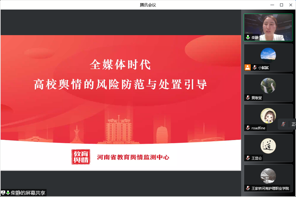 5月20日下午,我院在腾讯会议线上召开党委理论学习中心组(扩大)学习会议,邀请河南省教育舆情监测中心副主任柴静作《全媒体时代高校舆情的风险防范与处置引导》专题培训。学院领导班子成员,各党总支(直属党支部)书记,各系部、处室负责人参加学习,会议由党委书记杜天信主持。