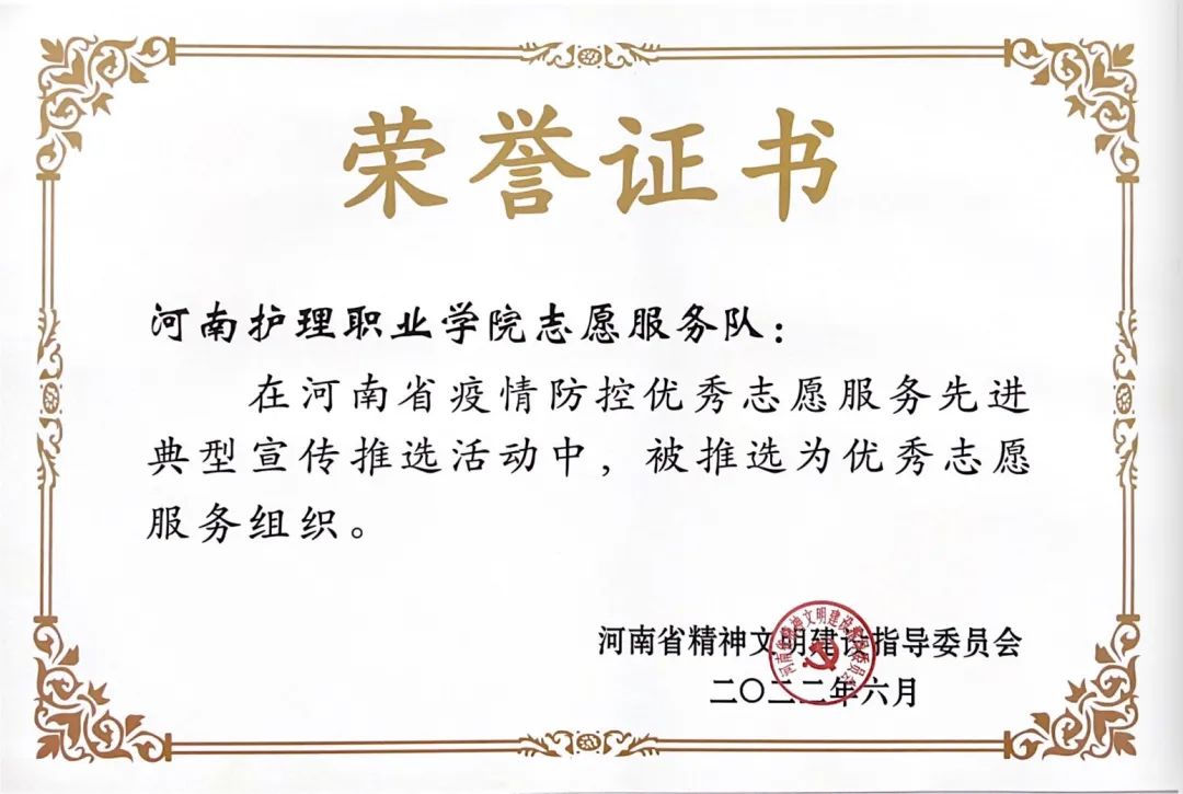 近日,我院志愿服务队在河南省疫情防控优秀志愿服务先进典型宣传推选活动中,被河南省精神文明建设指导委员会授予“优秀志愿服务组织”荣誉称号。