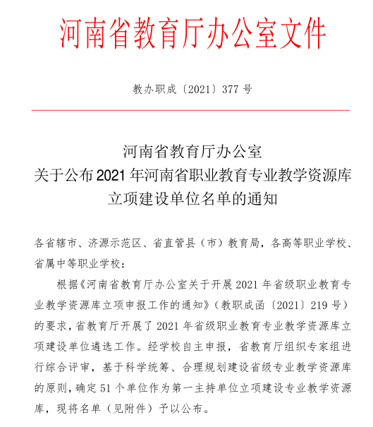 近日,河南省教育厅公布了2021年河南省职业教育专业教学资源库立项建设项目名单,我院作为第一主持单位与安阳市口腔医院联合建设的口腔医学专业资源库项目通过评审,获批立项为河南省职业教育专业资源库建设项目。