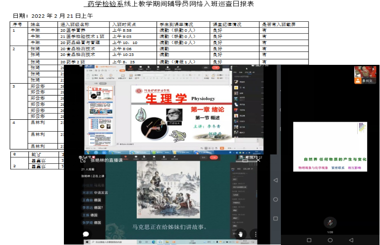 三是线上教学,云端育人。“延期不延教,停课不停学”,要求药学检验系全体专兼职教师,积极发挥线上网络课程平台的优势,利用智慧课堂、职教云、大学MOOC等教学平台提前发放精选教学资料、布置分量足够的学习任务,采用线上视频直播、音频直播、文字直播等形式,为学生尽可能提供丰富的教育教学内容,并对学生督促到位、鼓励到位,做到真正让学生保质保量地学起来、学进去、学出成效,强化学生的自我管理能力、提高学习自觉性、增强自学能力。21日上午,我系线上教学如期开课,药学检验系党政领导主动联系任课老师和辅导员,随机巡视课堂,详细了解教学安排、教学保障、教师到课、学生到课等情况,并及时提出建议和要求,当天教学运行顺畅有序。