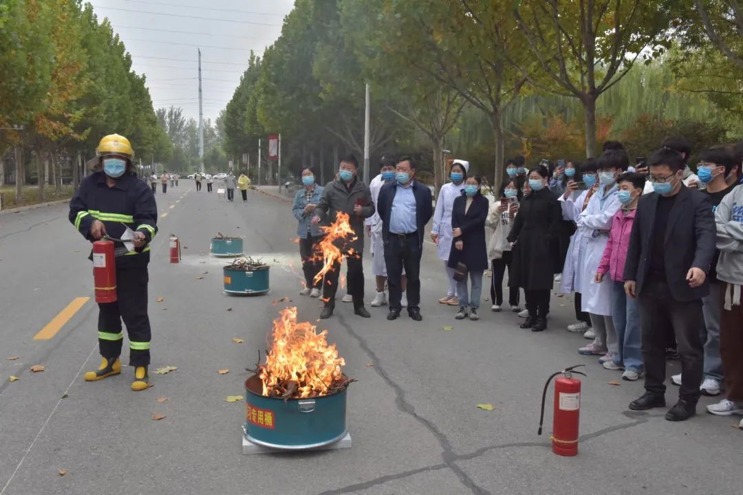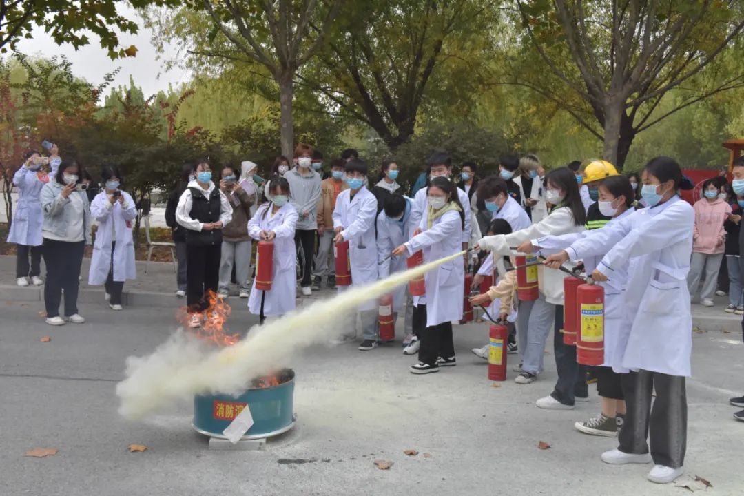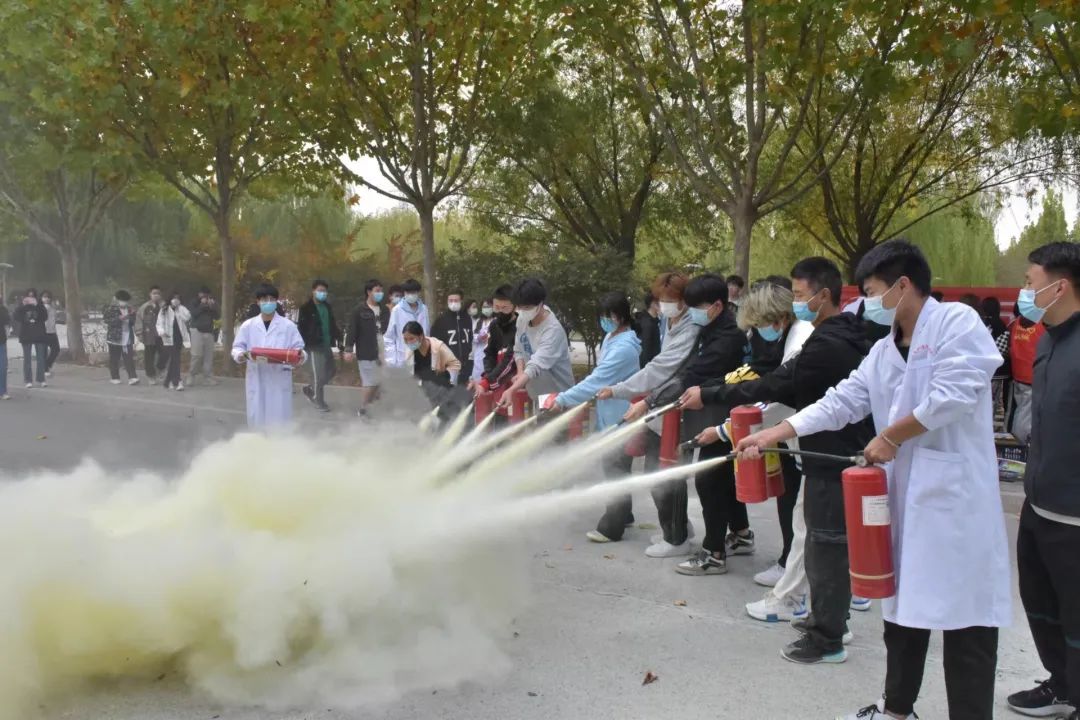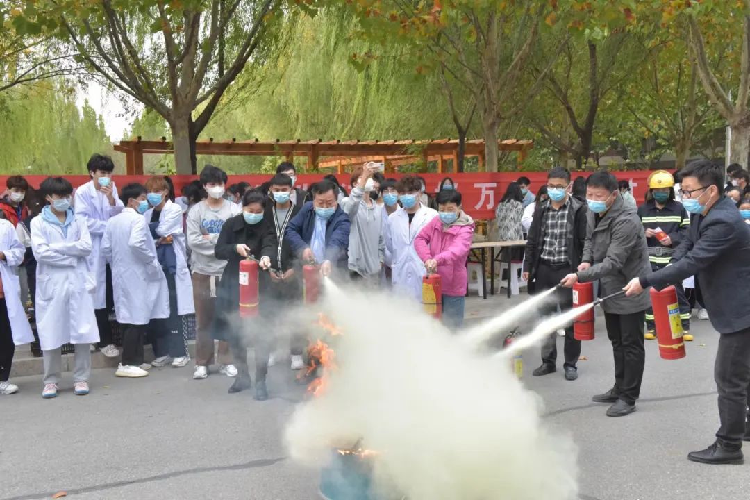 王院长及处室系部负责人使用干粉灭火器,共同熄灭了演习用的明火,用实际行动向同学们展示了灭火器的使用方法和注意事项。