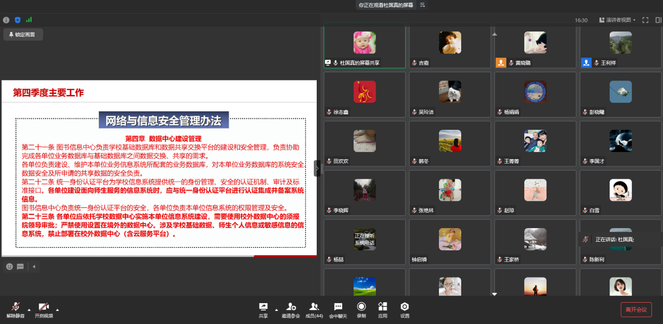 会上,图书信息中心老师杜国真首先对我院第四季度网络安全日常工作、网络安全事件处置情况以及重要时期网络安全防护工作等方面进行了详细汇报,并对明年网络安全方面的主要工作进行了探讨和交流。