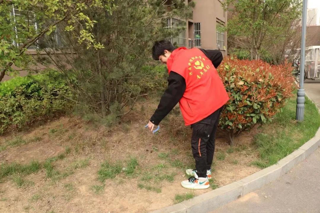志愿者在社区捡拾草丛垃圾