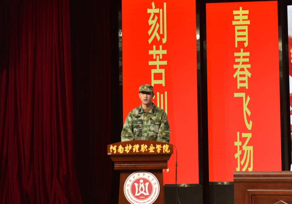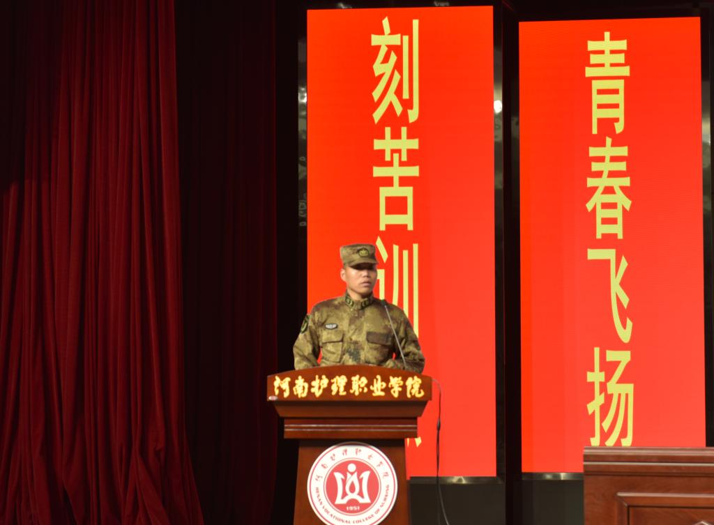 军训团教官代表发言,并对同学们提出希望和要求:端正思想,认真对待;加强组织纪律性,服从命令听指挥;不怕困难,刻苦训练;同学之间相互尊重,互相帮助,共同成长;军训中要注意人身安全等。