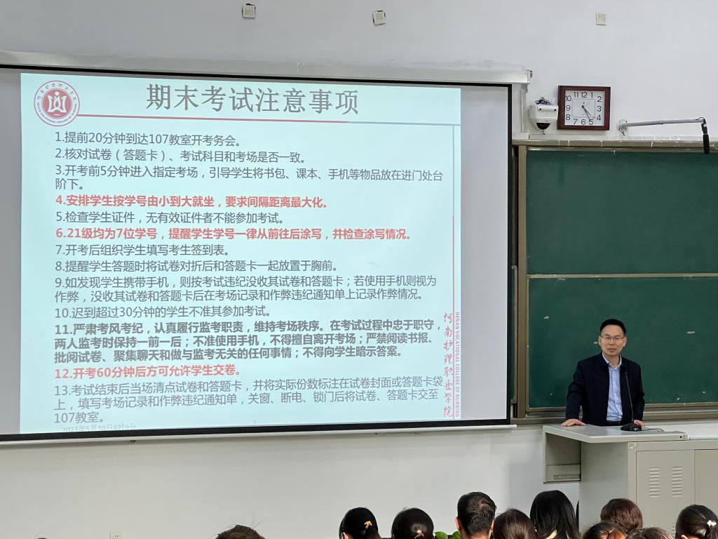 5月10日下午,2021级12周结课专业学生期末考试考务会在教学楼107教室召开。教务处朱秀敏处长主持考务会,钟会亮副院长对考风、考纪进行了强调,并带队对考试考场进行了巡视。