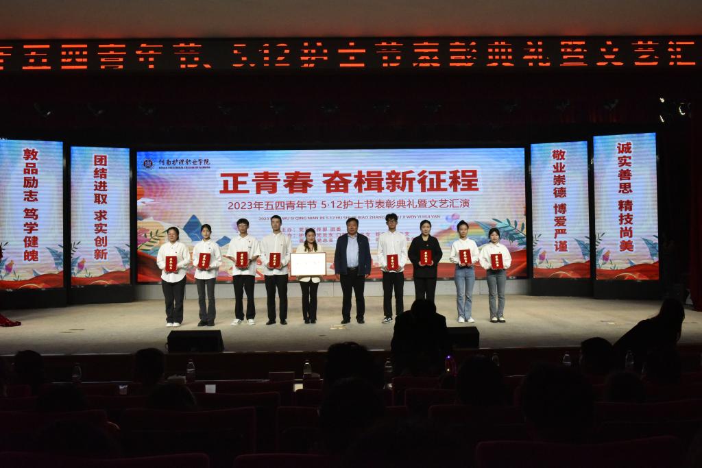 在热烈的掌声中,学校领导依次为优秀共青团员荣誉称号的学生代表、获得“五四”红旗团总支(团支部)的单位、获得2021-2022年度“省直优秀共青团员”的同学、 “省直五四红旗团支部”的班级、团委以及护理技能大赛获奖选手代表、第五届“最美护生”暨河护天使之星获奖代表颁奖。