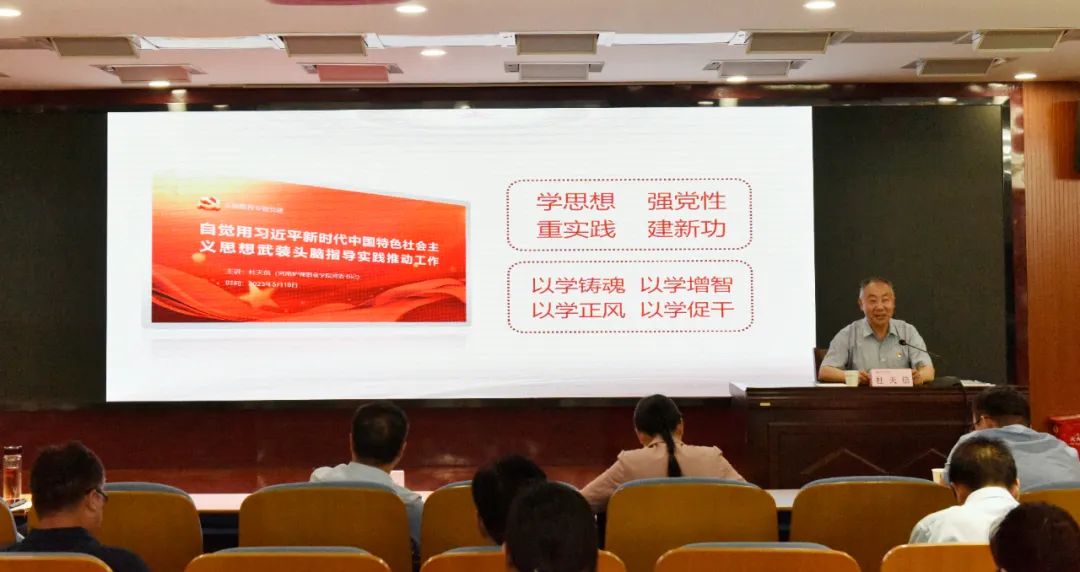 为深入推进学习贯彻习近平新时代中国特色社会主义思想主题教育走深走实,根据主题教育工作安排,5月16日下午,校党委书记杜天信以《自觉用习近平新时代中国特色社会主义思想武装头脑、指导实践、推动工作》为题讲授专题党课。省委教育工委主题教育第四巡回指导组副组长曹相智,成员戴晓琴、王亚锴莅临学校指导,学校领导班子成员、全体副科级以上干部、党总支及党支部支委成员到场聆听。