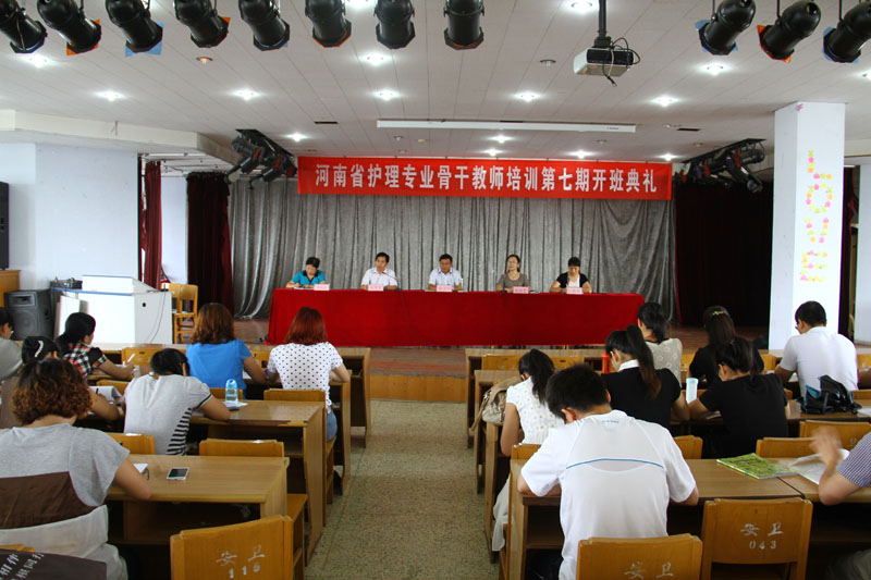 2013年7月16日上午,河南省护理专业教师培训班开班典礼在图书馆五楼多功能厅隆重举行,这是我院自2007年以来连续承办的第七期全省骨干教师培训。院长郭茂华、副院长张淑爱、教务处处长黄敬堂、副处长吕海琴、培训班班主任周凤清出席开班典礼,副院长张淑爱主持典礼,来自全省共11所中等卫生职业学校的29名教师和我院25名新任教师参加开班典礼。