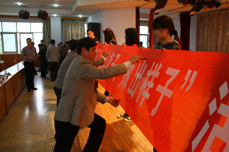 随后,在“亮出牌子、举起旗子、做出样子”活动启动仪式上,胡景团副书记代表学院党委向大家宣读了“亮出牌子、举起旗子、做出样子”党员活动倡议书。院领导和部分离退休老党员分别为今年新入党的师生党员代表佩戴党员标志徽章。全体党员在安阳市优秀共产党员许丽老师的带领下,重温了入党誓词,并在“亮出牌子、举起旗子、做出样子”活动条幅上进行了集体签名。