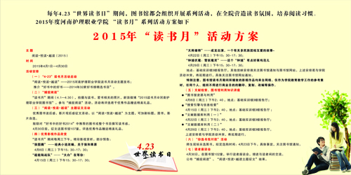 在“4.23”世界读书日来临之际,学院图书馆开展2015届读书月活动,活动主题为“阅读·悦读·越读”,这是图书馆自2010年以来第五次开展读书月活动,今年比往年新增3项活动。