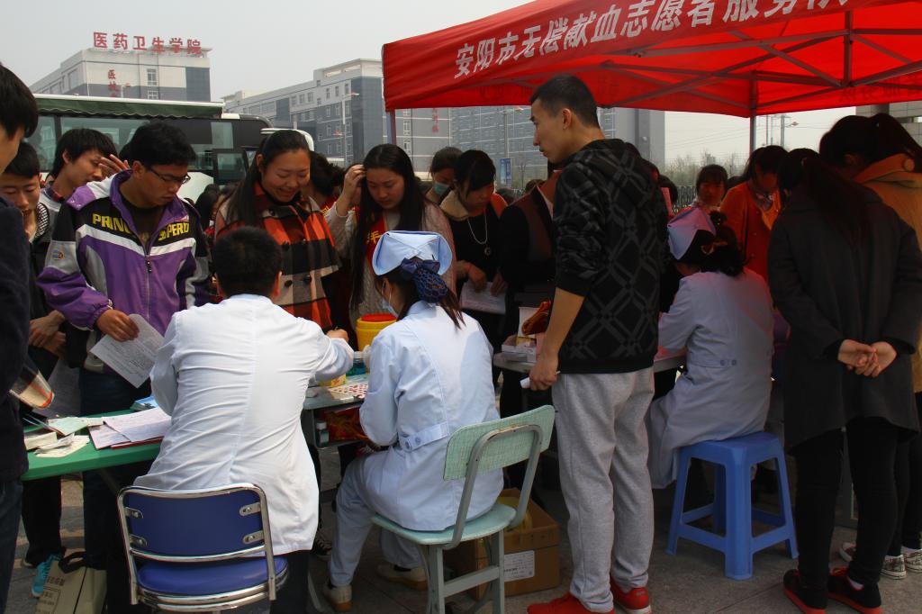 采血现场,师生们的热情高涨,短短的时间就排起长长的队伍,前来献血的师生们秩序井然的填表、量血压、验血型、献血、领取献血证。许多同学都是第一次献血,在献血的刚开始很紧张,但在医护人员的鼓励下,渐渐地放松了自己,都坚持按要求完成献血。青春的脸上,昭示着年轻的气息,诚挚的微笑下,闪耀的是爱的光芒。鲜红的血液,彰显的是大学生高尚的道德情操。献血不仅是健康的标志,更是每个公民应尽的义务。许多献完血的同学都纷纷表示:做为一名医护学生,更应发扬救死扶伤、无私奉献的南丁格尔精神,能为安阳血库补充一点自己的鲜血,能为社会奉献一份力量感到非常满足!微尘爱心社的志愿者在献血登记处安排了多个志愿者在不停的倒红糖水,随时给献完血的师生送上热水,进行细致周到的服务。
