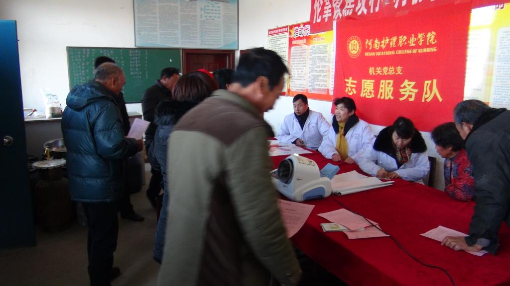 志愿队员一行8人来到焦家坟村委会后,与村委会负责同志就对口帮扶工作进行了座谈,详细了解了该村的基本情况和帮扶需求,并代表学院向焦家坟村捐赠了5000元爱心款。随后,志愿队员在村委会负责同志带领下,走访慰问了村里的5户生活困难户,并代表学院师生向他们送去了大米和食用油等生活慰问品。与此同时,校医院4名医护人员为村民开展了健康体检和医疗服务活动,热情解答村民对疾病防控知识的咨询,并向他们发放了冬季健康保健知识和艾滋病防控知识宣传单200余份。在短短3个小时内,50余名村民接受了免费体检和疾病治疗知识指导。