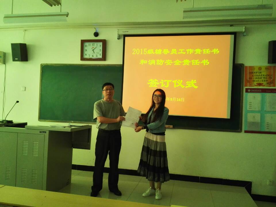 学生处郭海旺处长就辅导员职责、加强学生安全意识提出了要求:一.抓好学生日常教育管理工作,掌握学生思想动态;二.深入排查,全面梳理,切实做好学生安全教育管理工作;三.关注特殊群体,做好心理健康教育。并与各位新班级辅导员签订了《辅导员责任书》《安全事故责任书》。