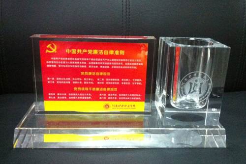 摆台整体设计端庄、大方,以党旗为背景,正反两面印有《中国共产党廉洁自律准则》全部内容,共298字,笔筒正面刻有“弘扬爱心、鼎立中原、走向世界”的学院校徽。放于桌前,使党员和干部能时刻牢记道德高线,守住纪律底线,清清白白做事,干干净净做人。