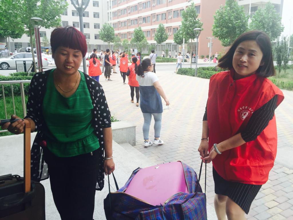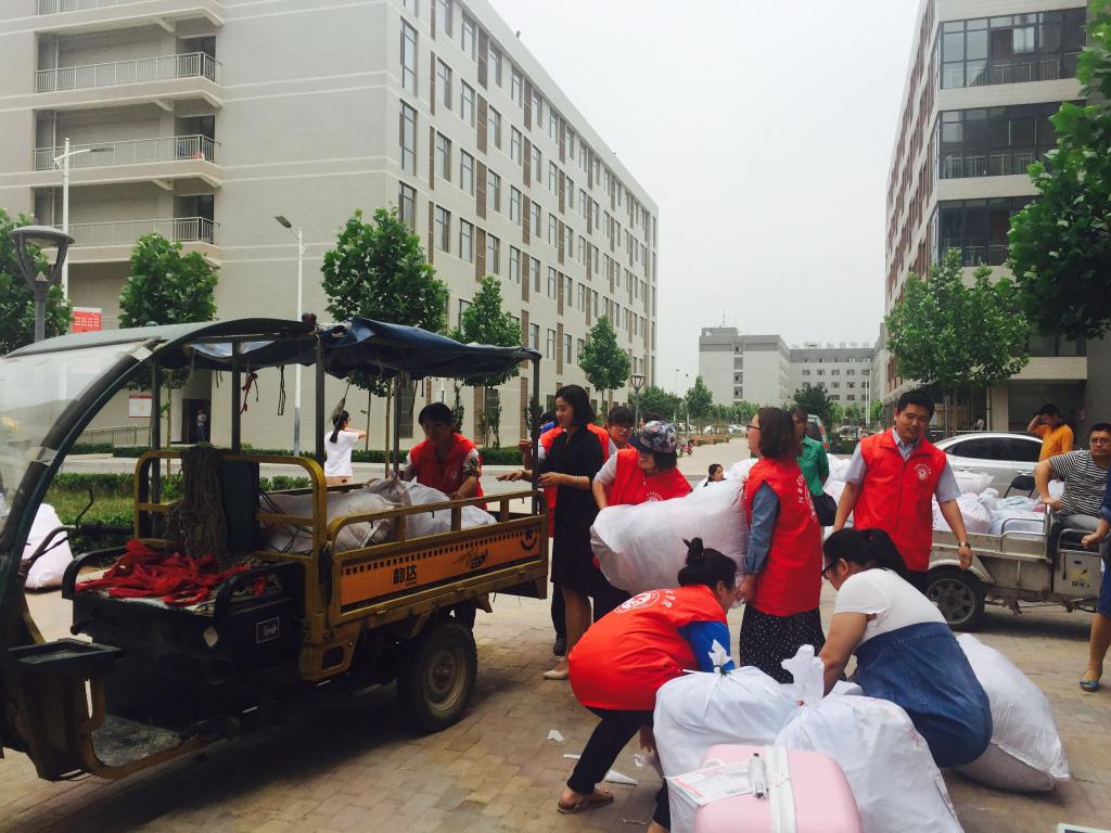 志愿者们在二、三号学生公寓楼下,接过离校学子们手中的一件件行李,小心地放在搬运车上,又细心护送到公交车站牌前。一路上,汗滴沁满志愿者们的额头,身穿红色服装的志愿者们成为一道道亮丽的风景线,受到了广大离校学生和家长的高度评价。